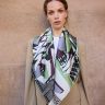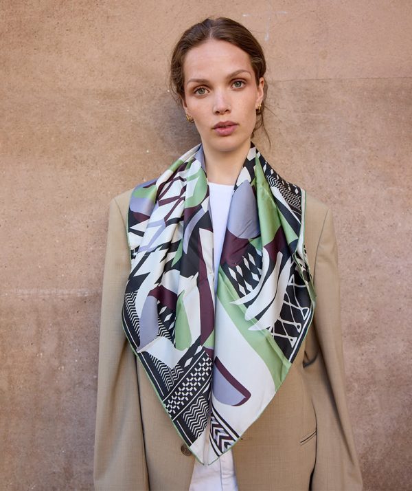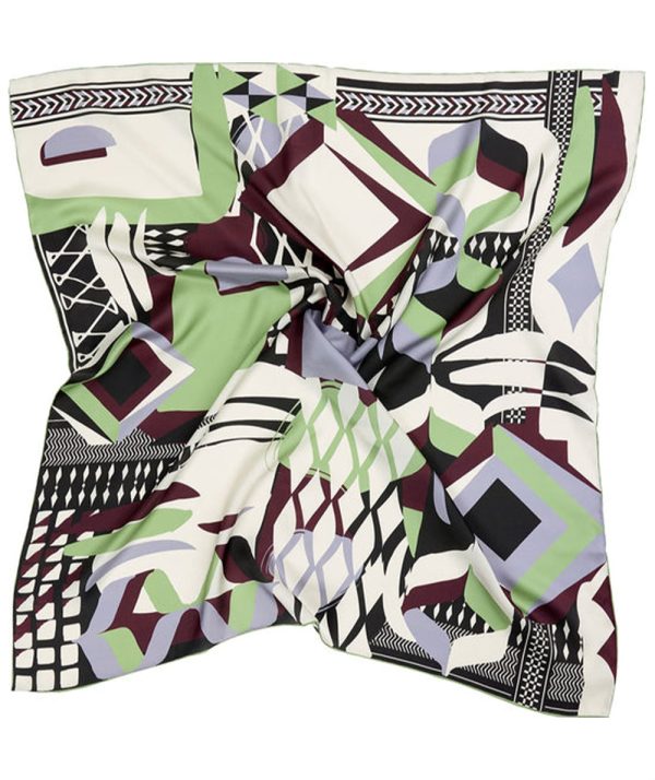 Square silk scarf with graphic vintage motif. Many styling options.
