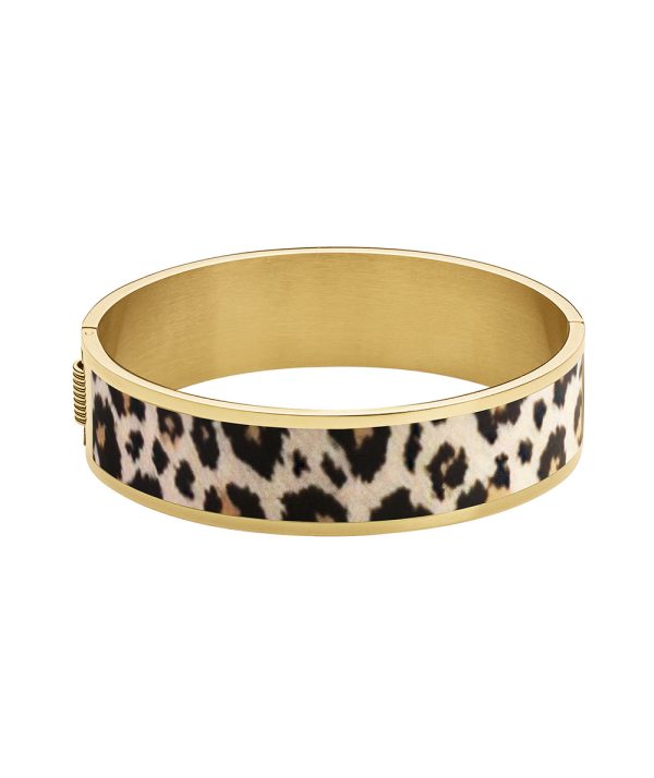 - CRISTEA – A sturdy stainless steel bracelet featuring an animal printed inlay. Hinge clasps on side secures easy access