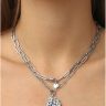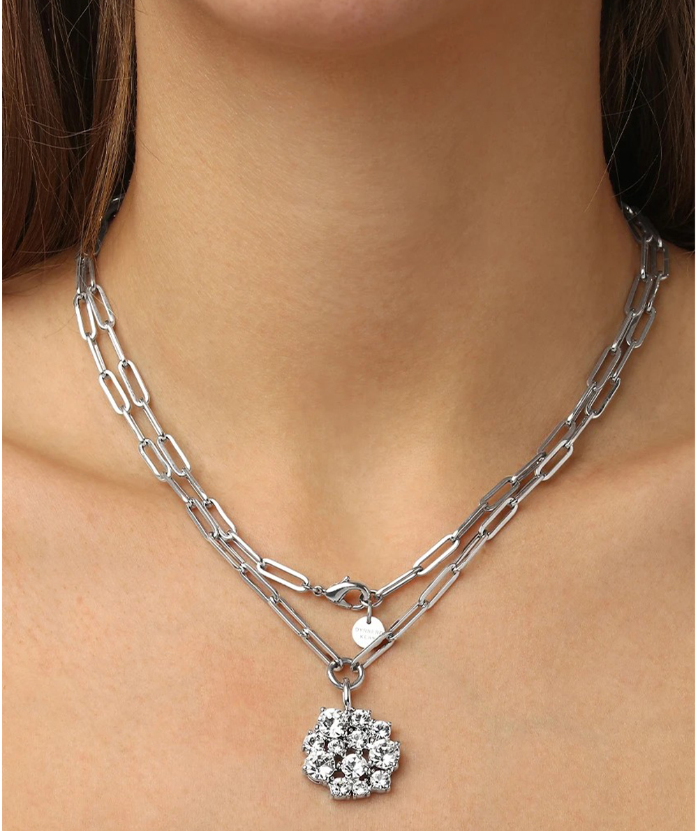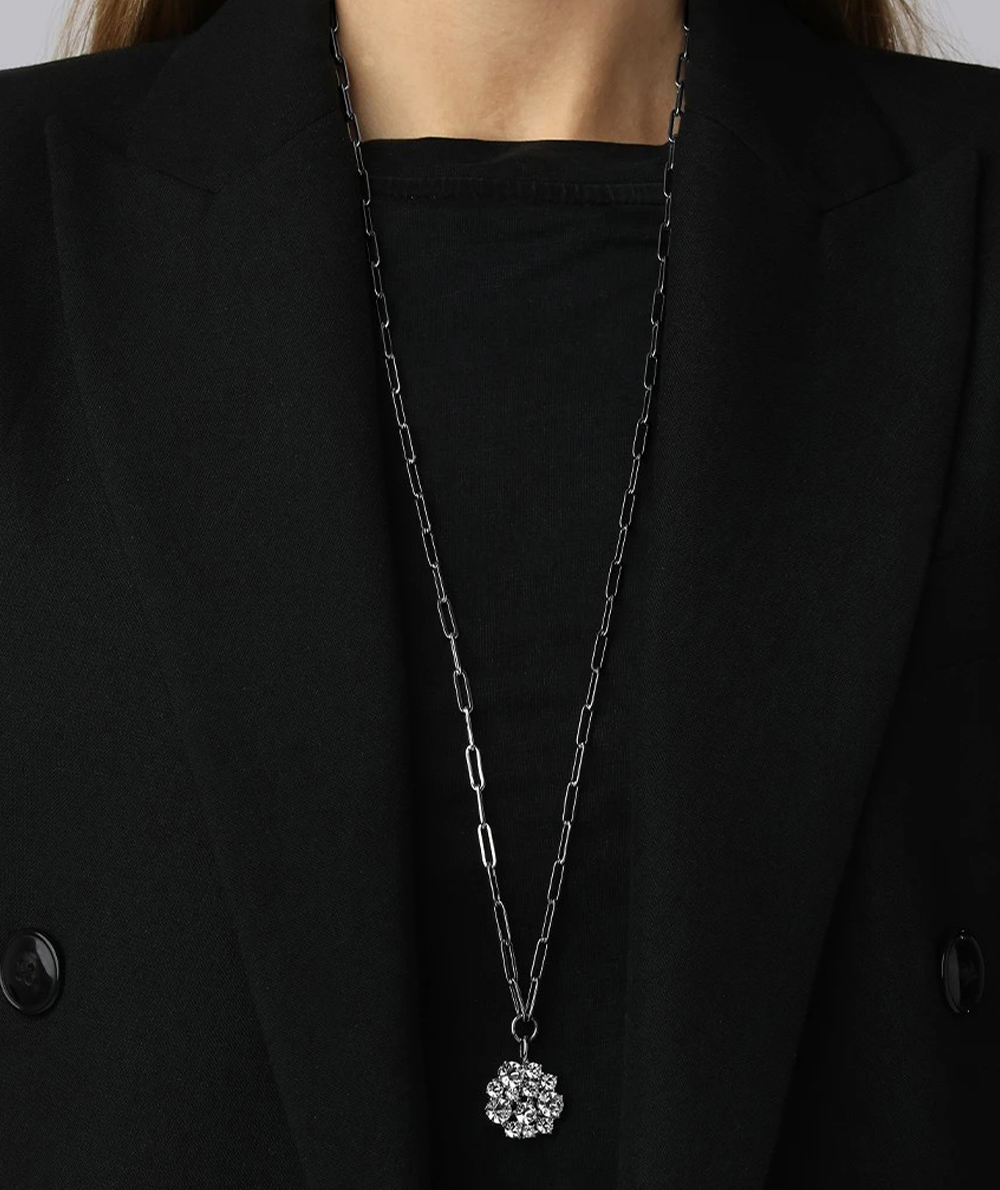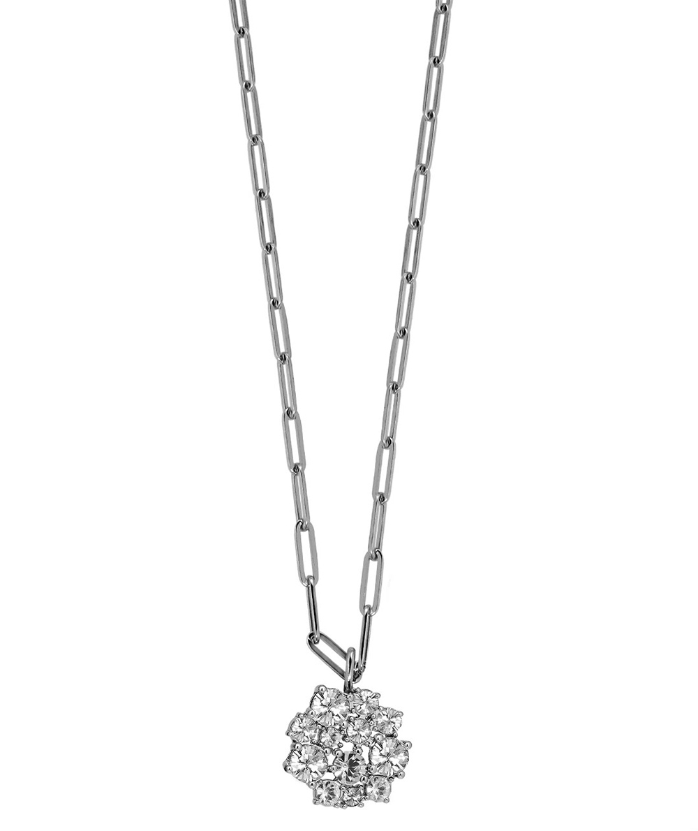 - Pendant is designed with multible smaller and larger round facet cut crystal chatons, asymmetrically set in a round pattern