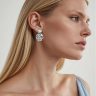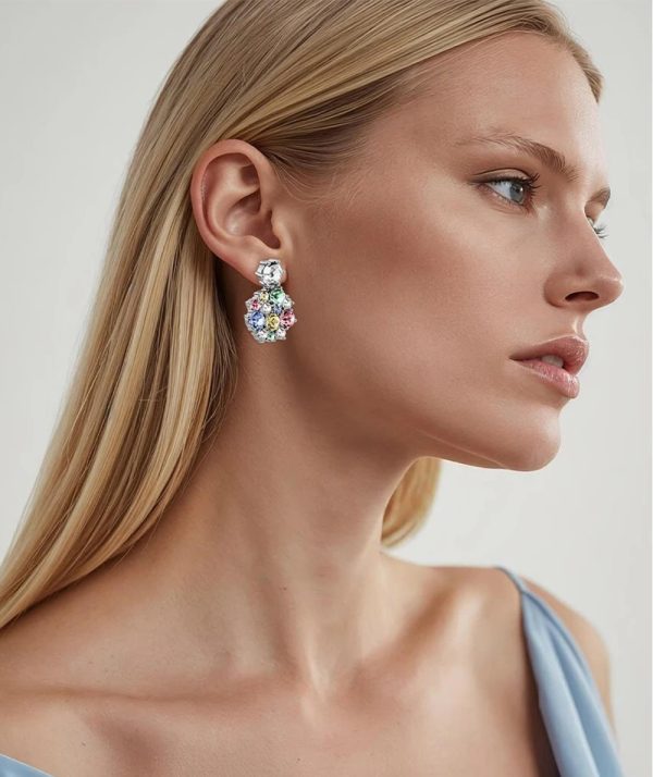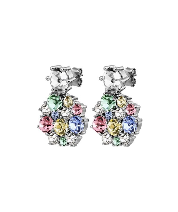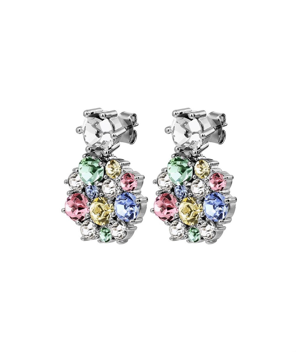 - FREESIA – is a an elegant and unusual stud post party earring, designed mith multible smaller and larger round facet cut crystal chatons, asymmetrically set in a round pattern