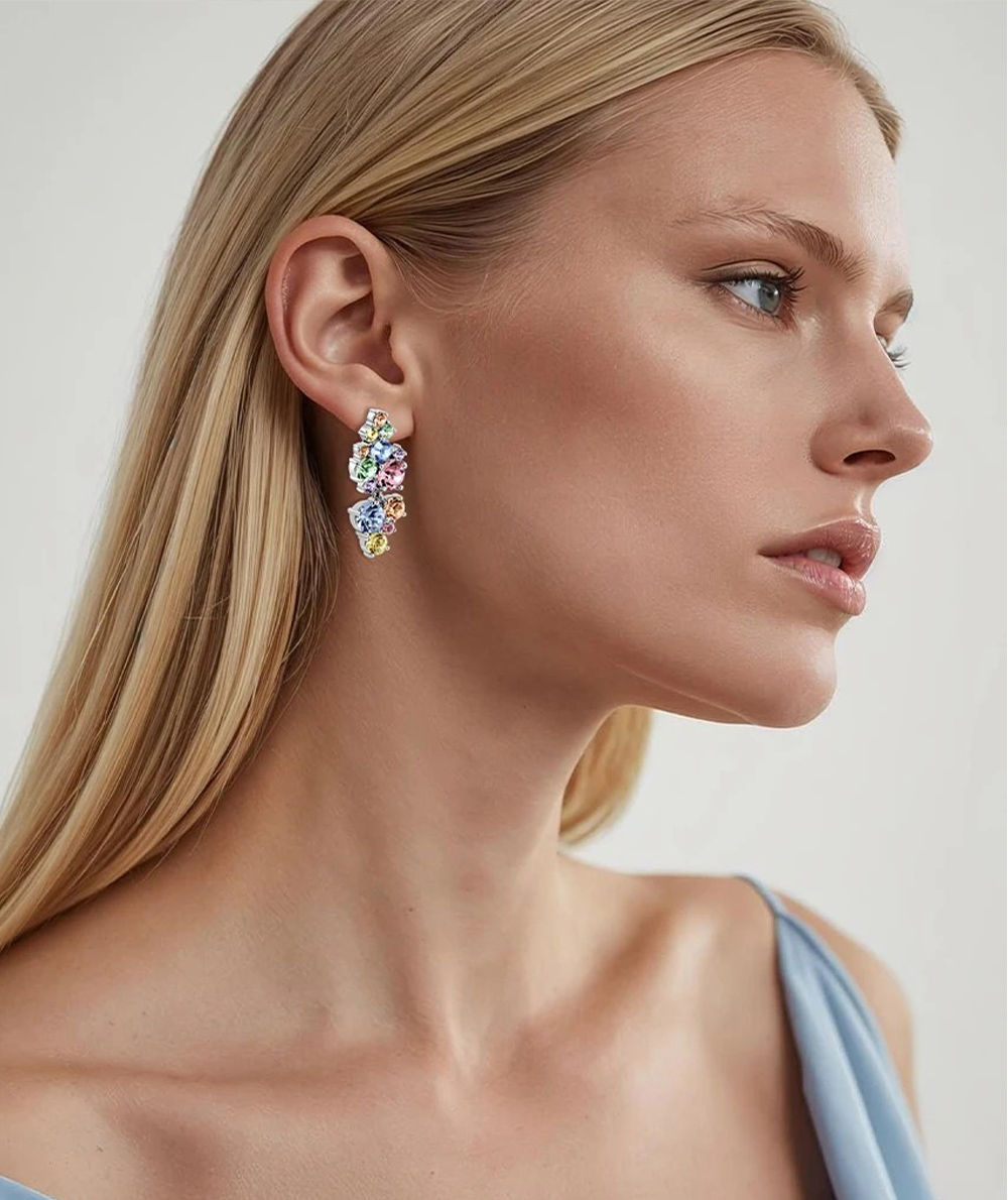- MARIGOLD – an elegant and unusual stud post party earring, designed mith multible smaller and larger round facet cut crystal chatons, set in an asymmetrical pattern