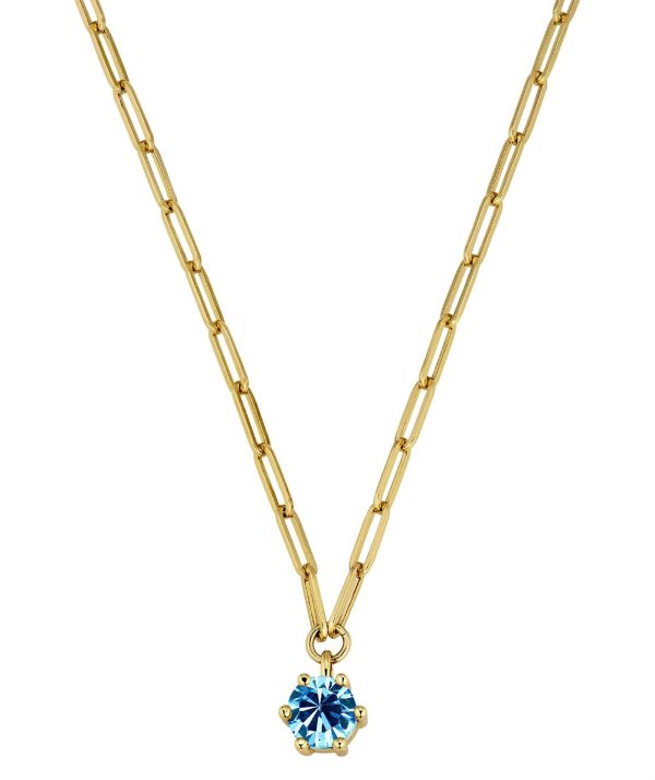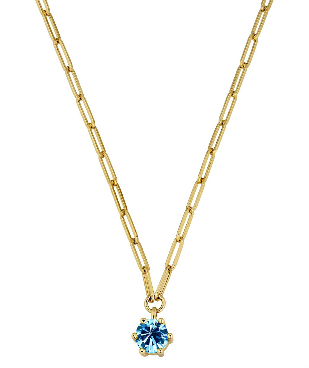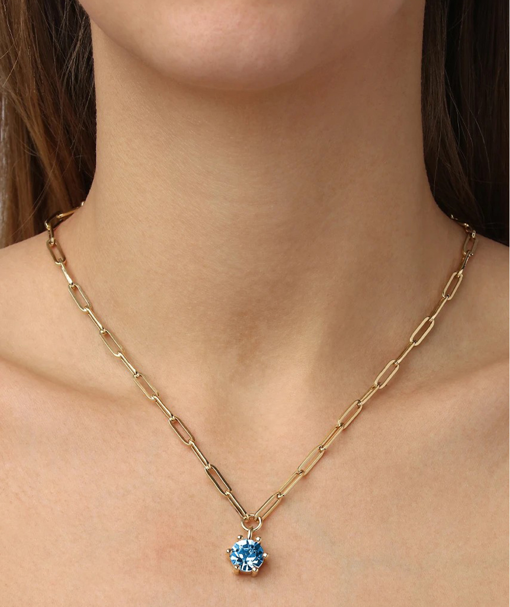 - TESSA is a cool and chunky short neck chain made in linked design. The solitaire pendant features a large sparkling facetted aqua blue crystal in a classic prong setting