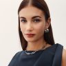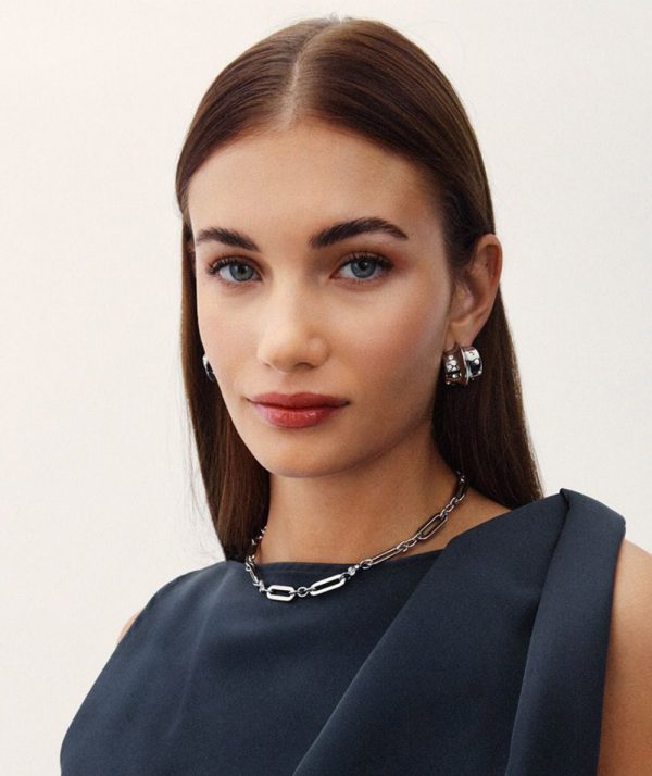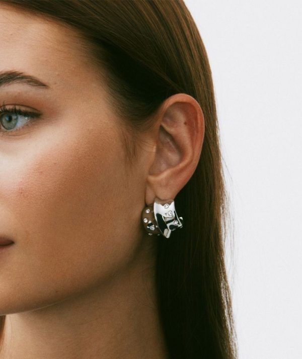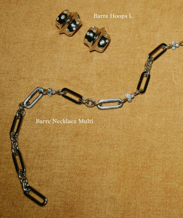 Eye-catching Barre is poetry in motion, inspired by the bar in a dance studio. With swelling round shapes, bold chains and decorated with playfully scattered sparkling stones. The larger hoops, seen here in shiny stainless steel, sparkle nicely and stand out on the ear