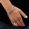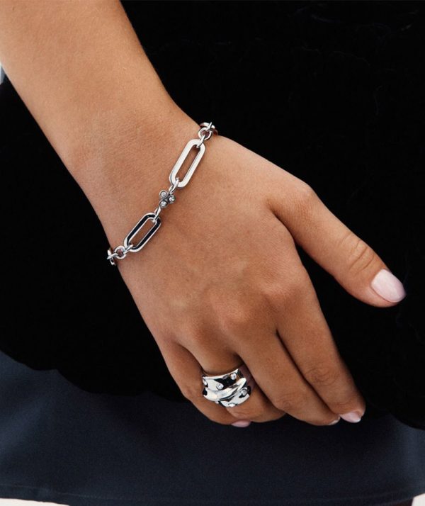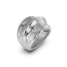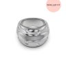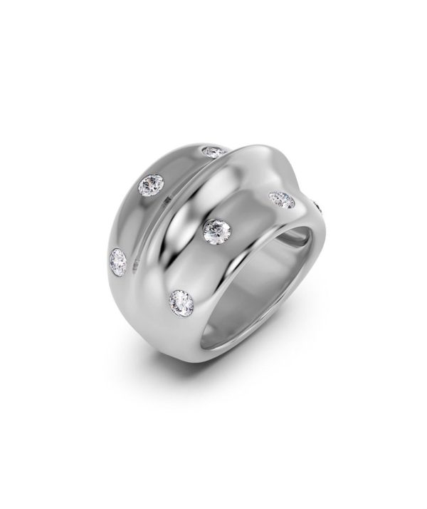 Eye-catching Barre is poetry in motion, inspired by the bar in a dance studio. With swelling round shapes, bold chains and decorated with playfully scattered sparkling stones. The striking ring, seen here in stainless steel