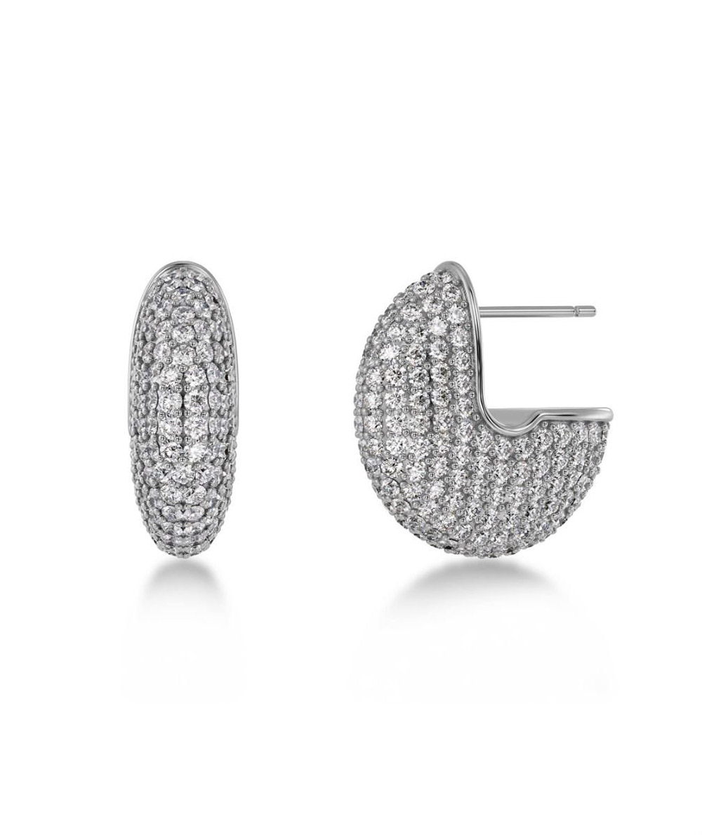Both timeless and fashionable, the luxurious Bisque Pavé is crafted in sterling silver. The hoop embodies the series’ swelling round shape, decorated fully with glittering stones, fitted tightly around the earlobe