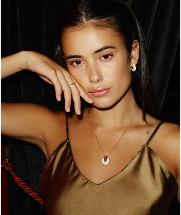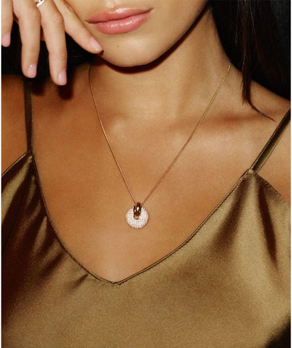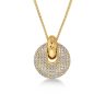 The timeless yet contemporary luxury of Bisque Pavé in sterling silver, is seen here in 14K gold plating. In this necklace, the series’ swelling round shape is decorated with sparkling stones, and floats beautifully in an elegant ring setting