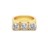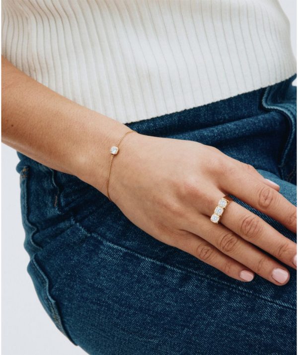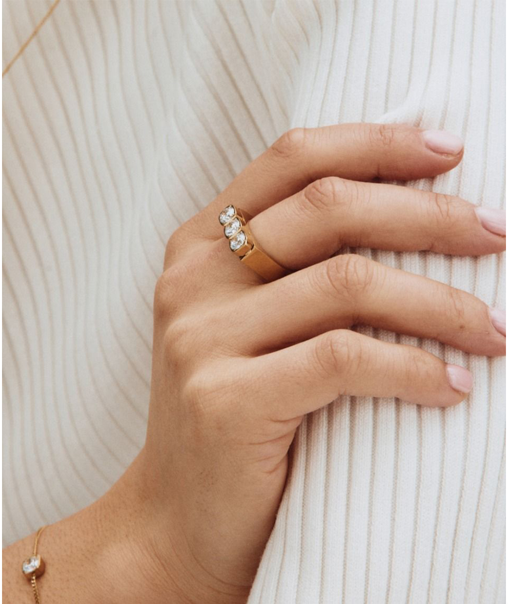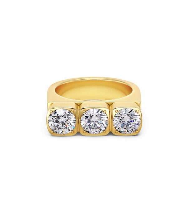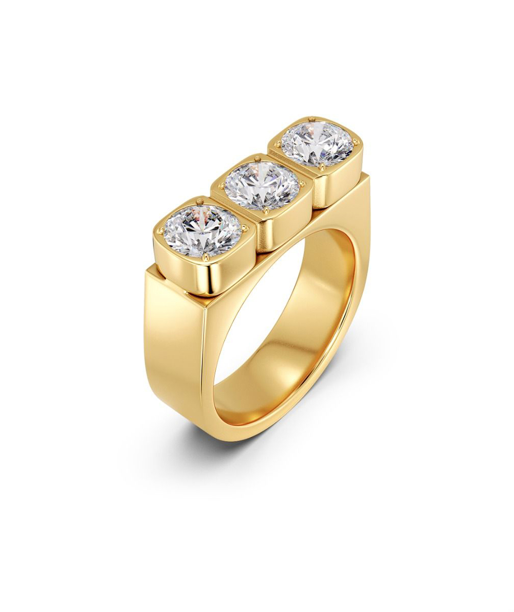 Sassy Gemma delivers rebellious glamour, with round stones set in a square pattern. In this expressive ring, three stones sparkle in unison on a slightly heavier ring band, seen here in 14K gold plating