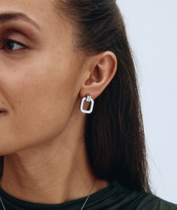 The softly shaped square of the beautiful Plaza series is perfect for adding a stylish detail to any look. The larger studs, seen here in shiny stainless steel, sit nicely on the ear and match with the necklace in two sizes