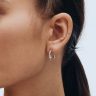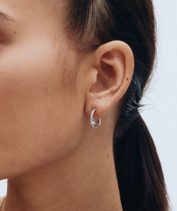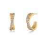 Movement and stillness go hand in hand in the lovely Twin series in sterling silver, seen here with 14K gold plating. In these beautiful hoops, two bands weave together seamlessly, one richly decorated with shimmering stones and one without