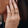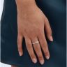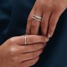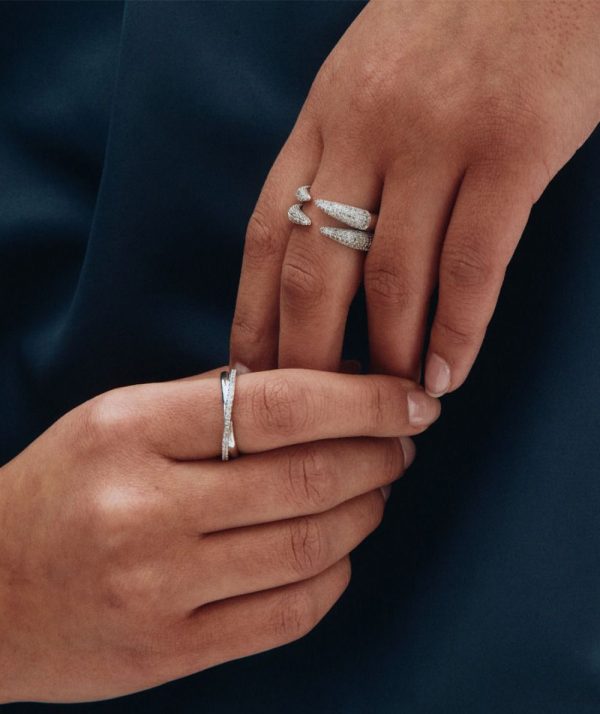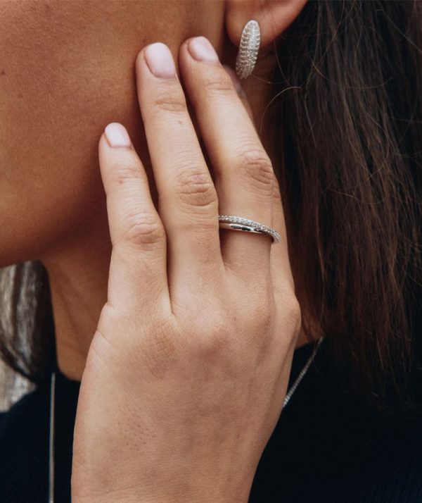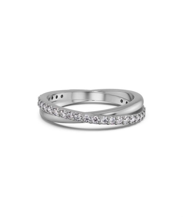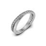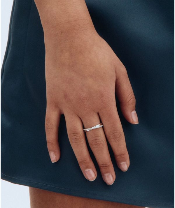 Movement and stillness are the essence of the Twin series seen here in sterling silver. This lovely ring offers two bands that weave together, one decorated with beautifully sparkling stones and one without