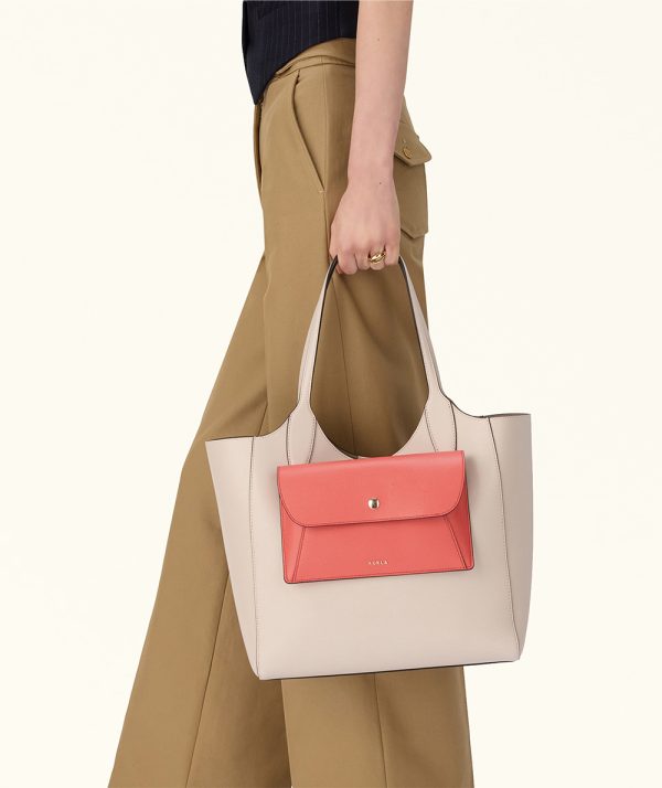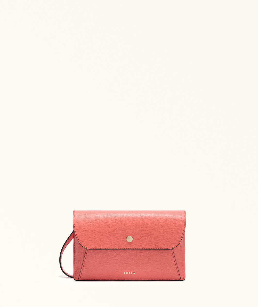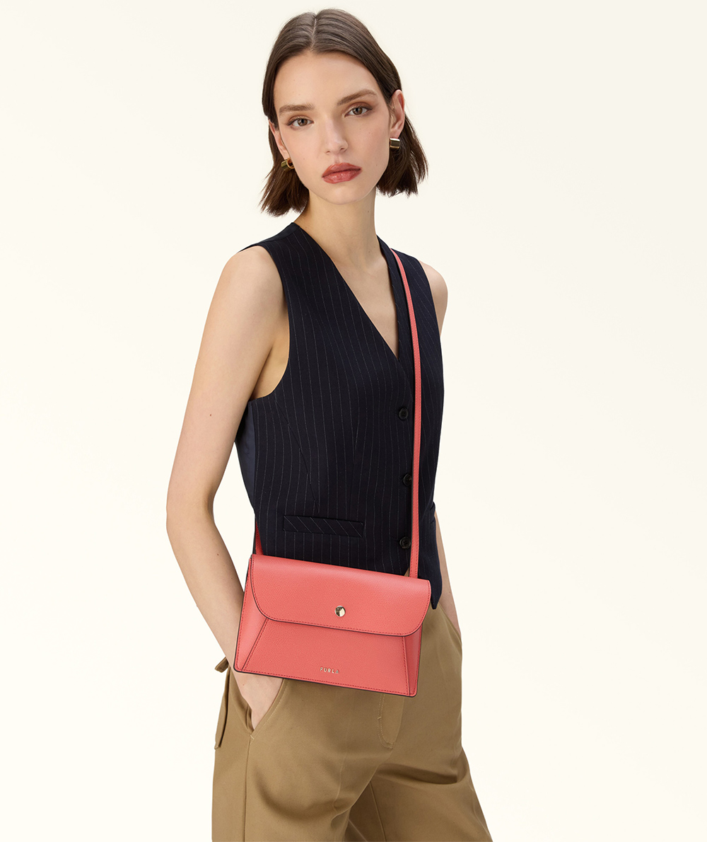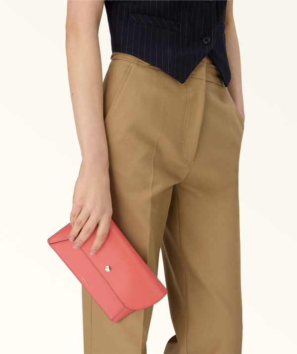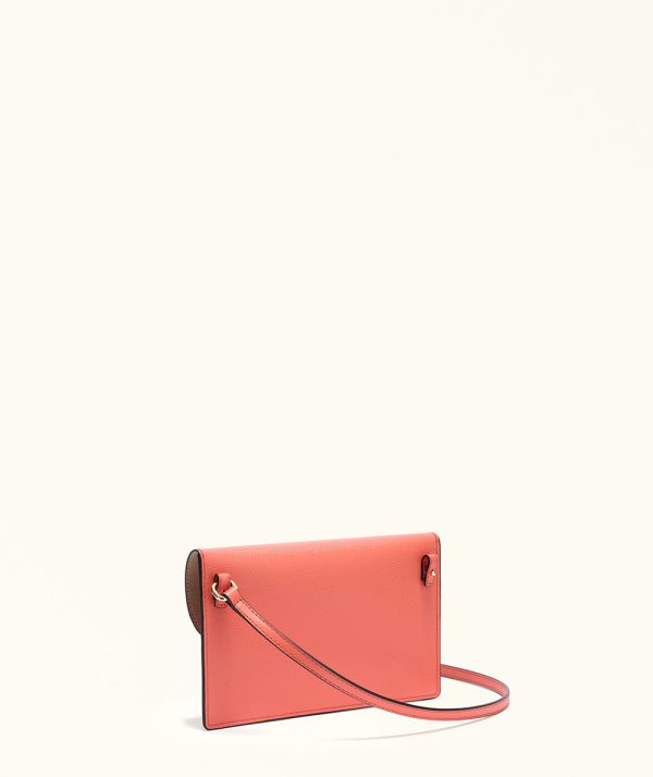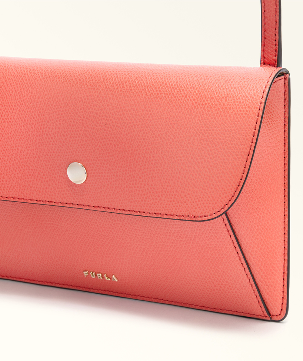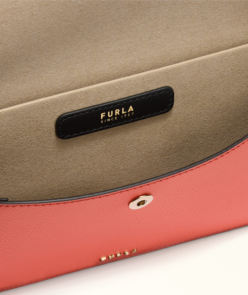 The Furla Lea pouch in textured leather offers compact versatility. Designed for attaching to the totes from the same line