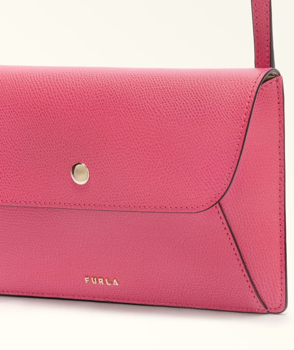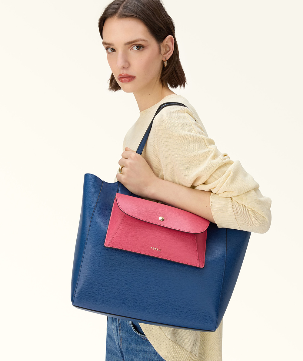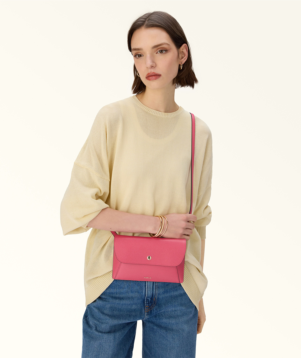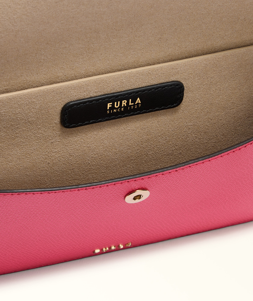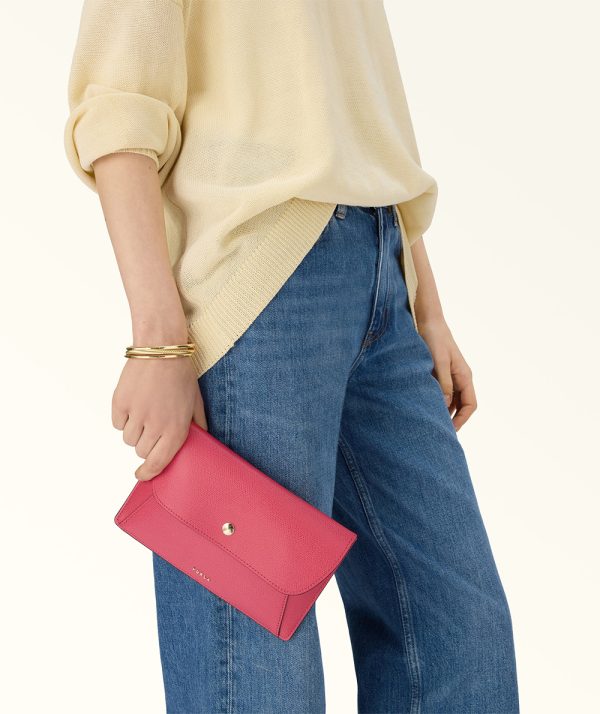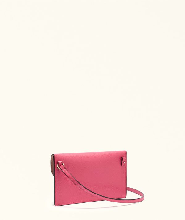The Furla Lea pouch in textured leather offers compact versatility. Designed for attaching to the totes from the same line