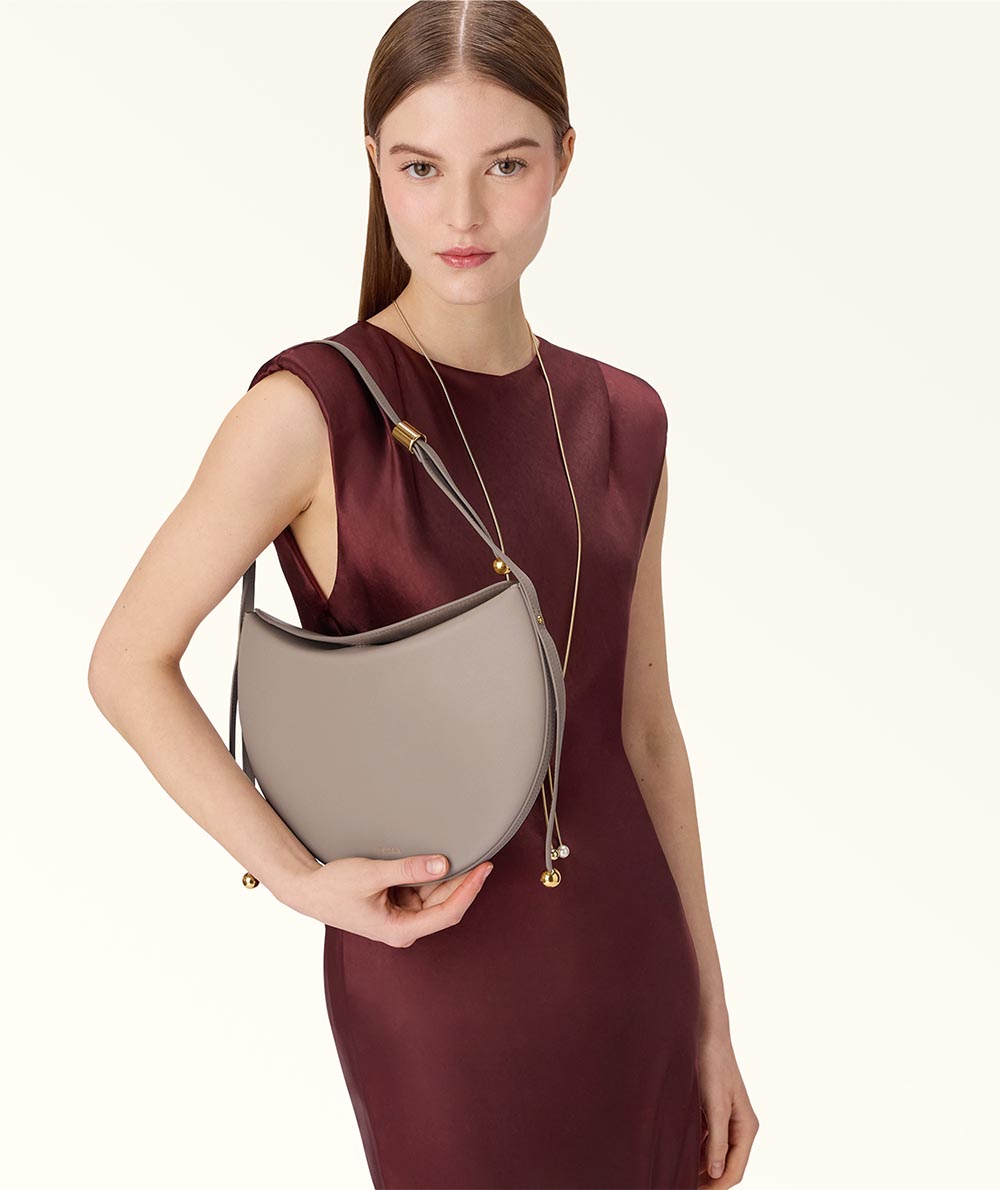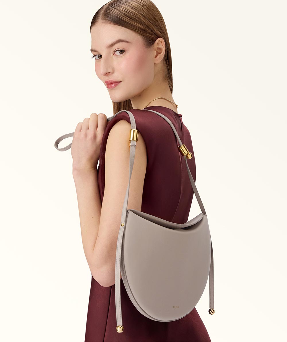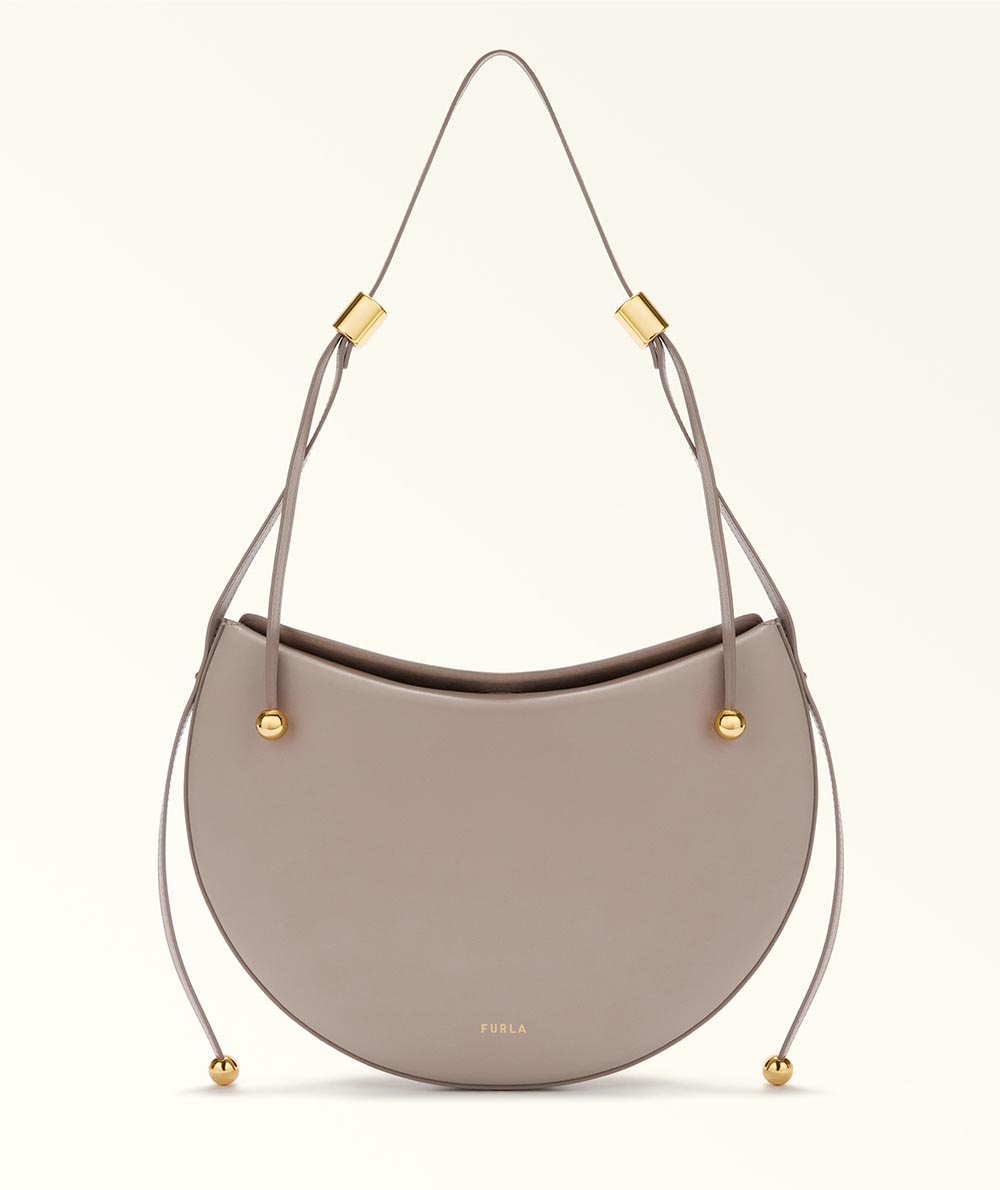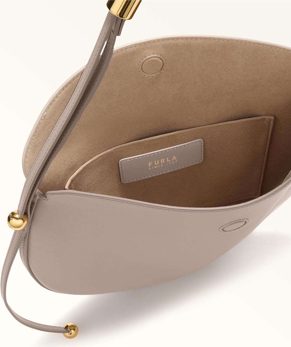 The Furla Moonstone shoulder bag has a contemporary saddle silhouette, its calfskin leather design elevated by clean and rounded lines