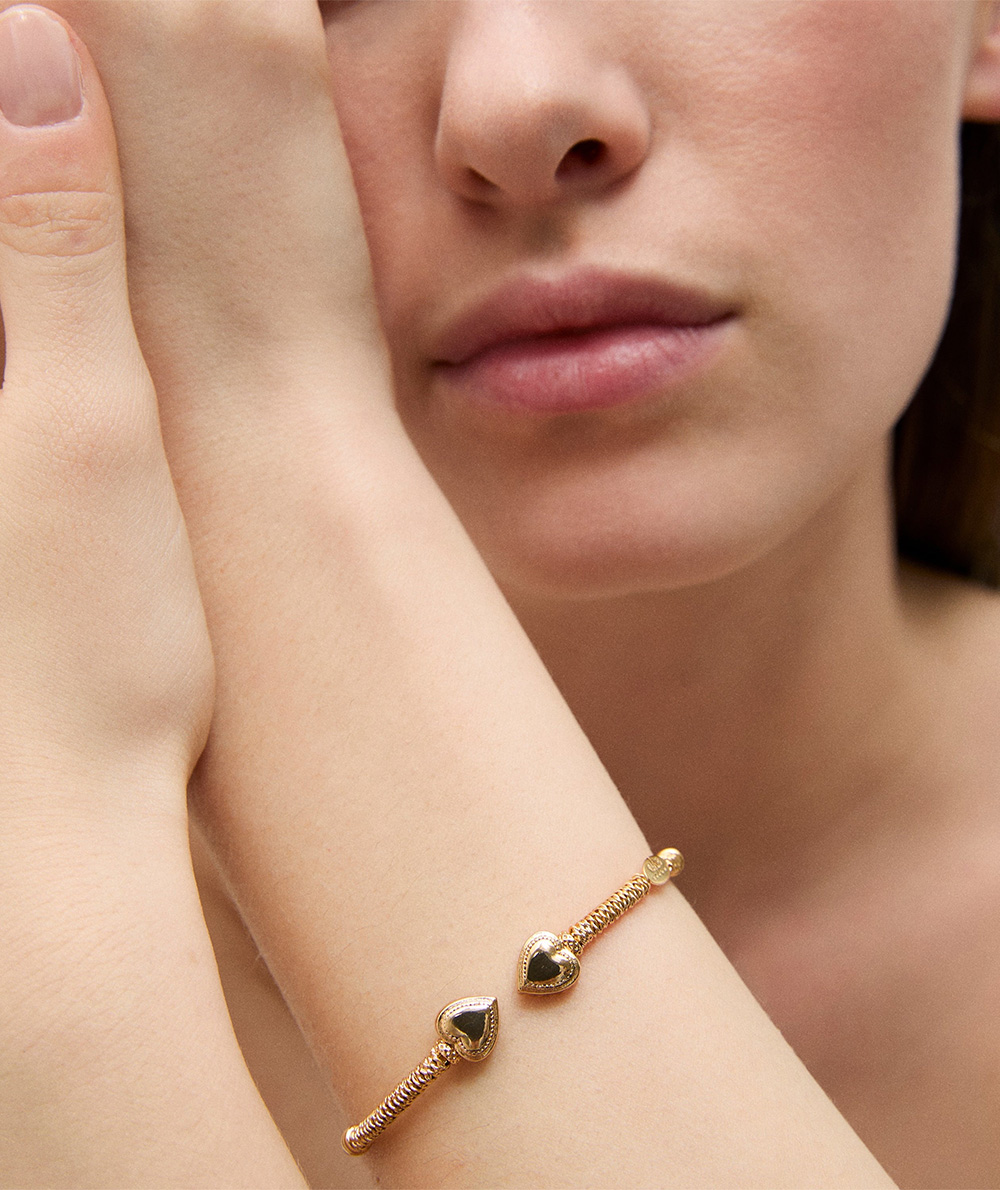 The Duality Amore bracelet elegantly and brilliantly reinvents the universal symbol of love. Gold-plated, this bangle, presented in delicate packaging, opens to reveal two delicately engraved hearts set with sparkling crystals, mirroring each other at either end