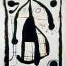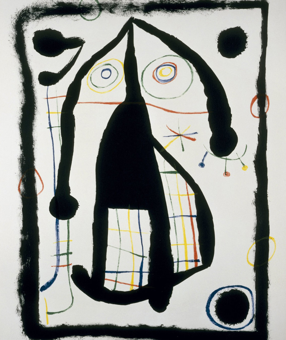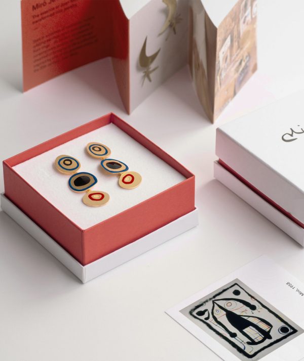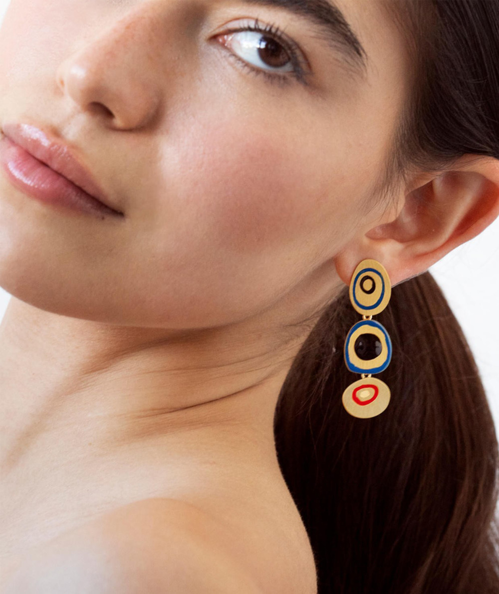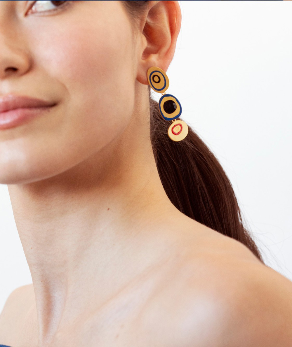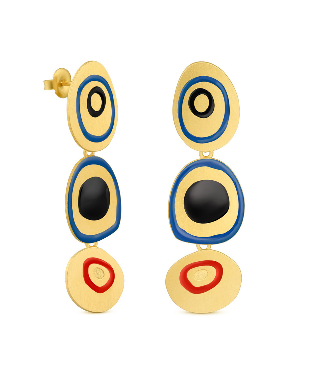 Golden earrings with irregular colored enamel circles, inspired by Joan Miró’s “L’Étrangère”, 1958.