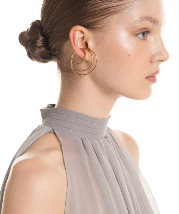 A bold reimagining of the classic earring takes shape in the form of a double spiral, capturing movement and balance across two circles that embrace the lobe, in a composition that seems to float effortlessly in space