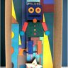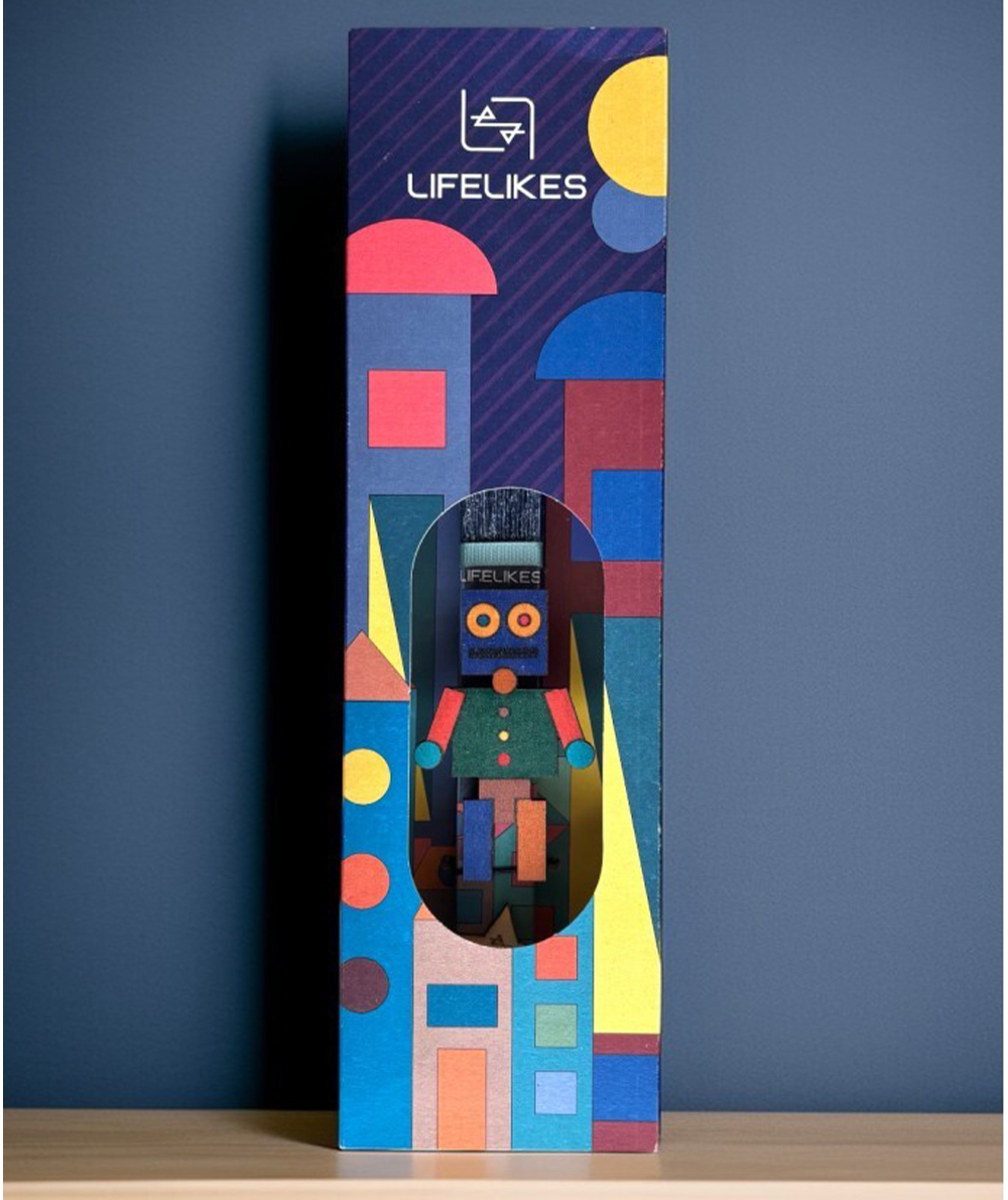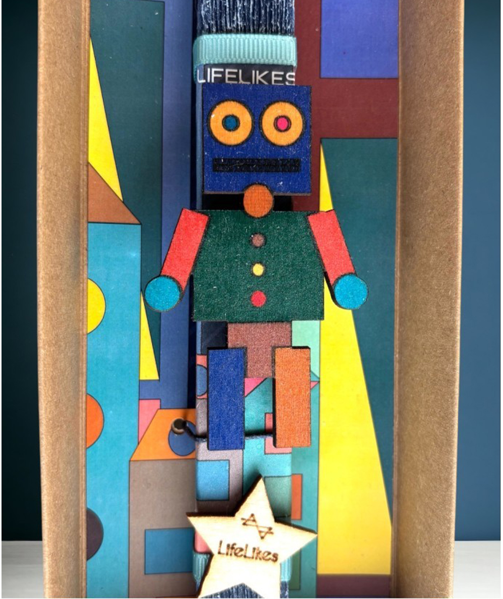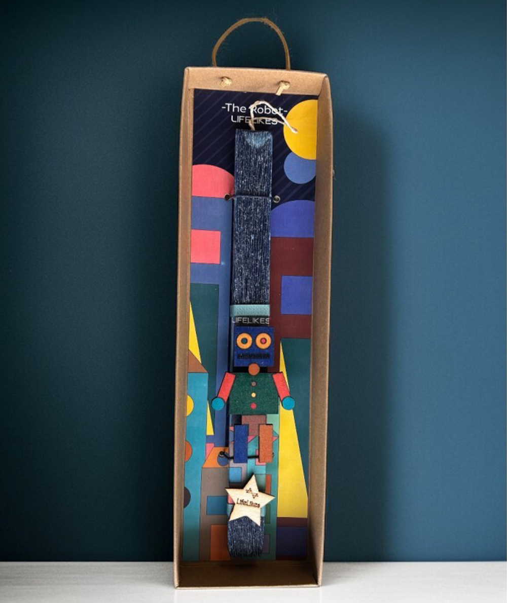Αυτή η πρωτότυπη λαμπάδα διαθέτει μοναδικά ξύλινα στοιχεία που σχηματίζουν ένα χαριτωμένο ρομπότ