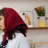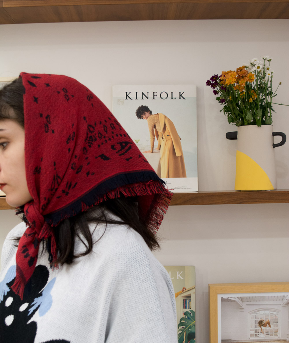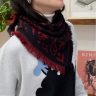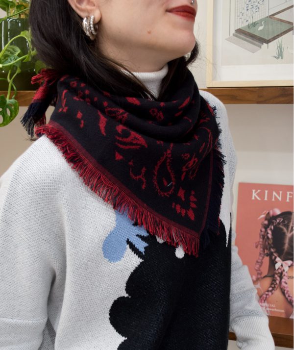 Pierre square knitted scarf with red and black fridges: