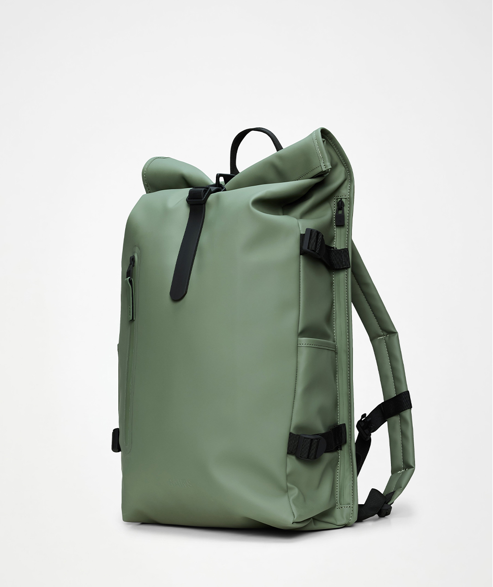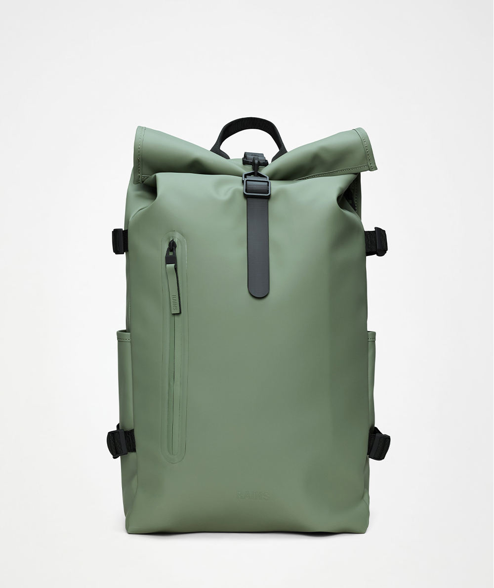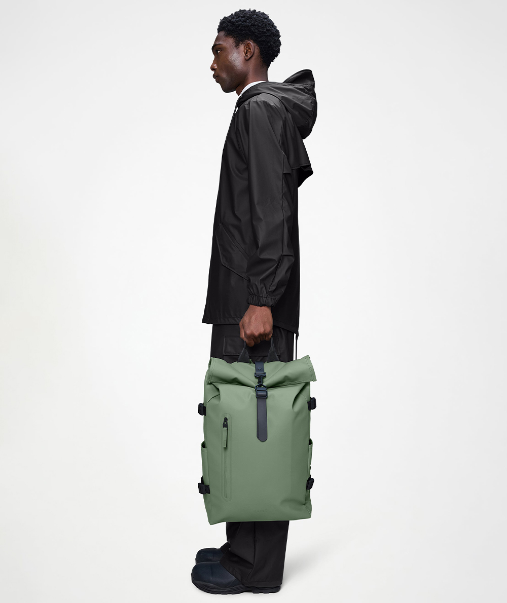 Rolltop Rucksack Large is a dependable city staple. The design interprets Rains’ most iconic Rolltop Rucksack with larger proportions and additional functionality