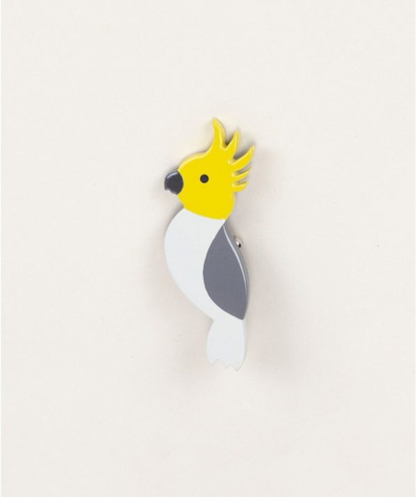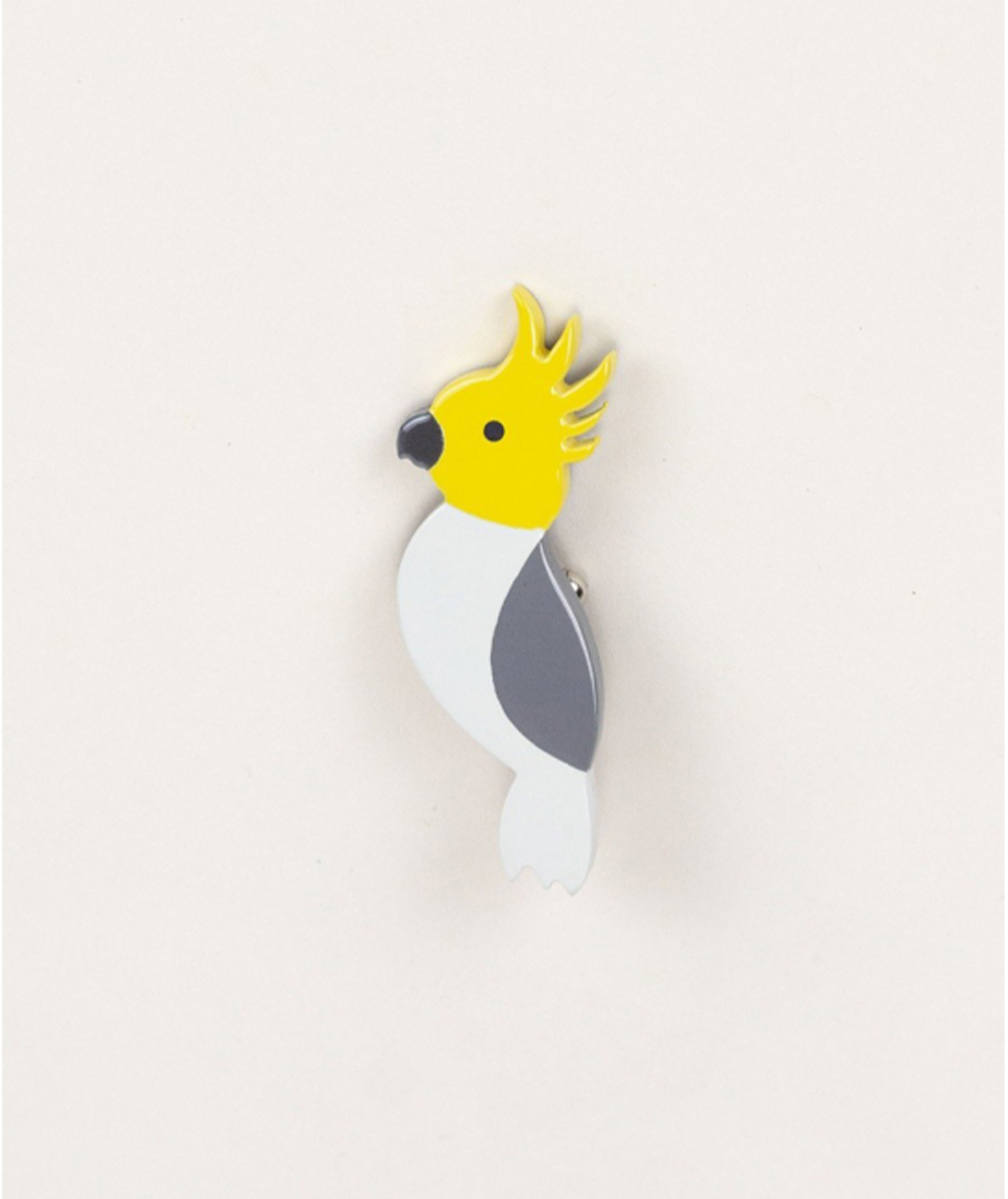 Cockatoo bird pin in horn with lacquer in gray and yellow